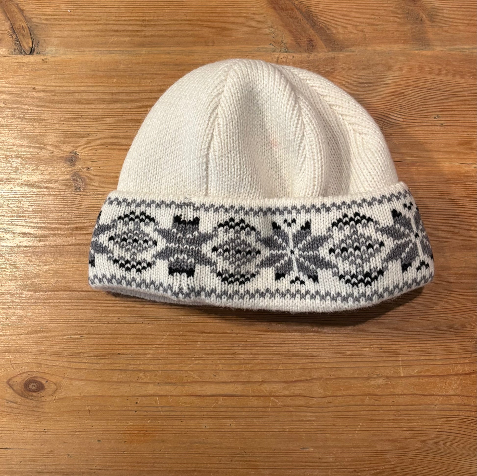 This hat is made from 100% wool and features a soft fleece lining for extra warmth and comfort. It comes in a light cream color with a classic Nordic snowflake pattern in gray and black along the fold. A timeless and cozy choice for cold winter days.