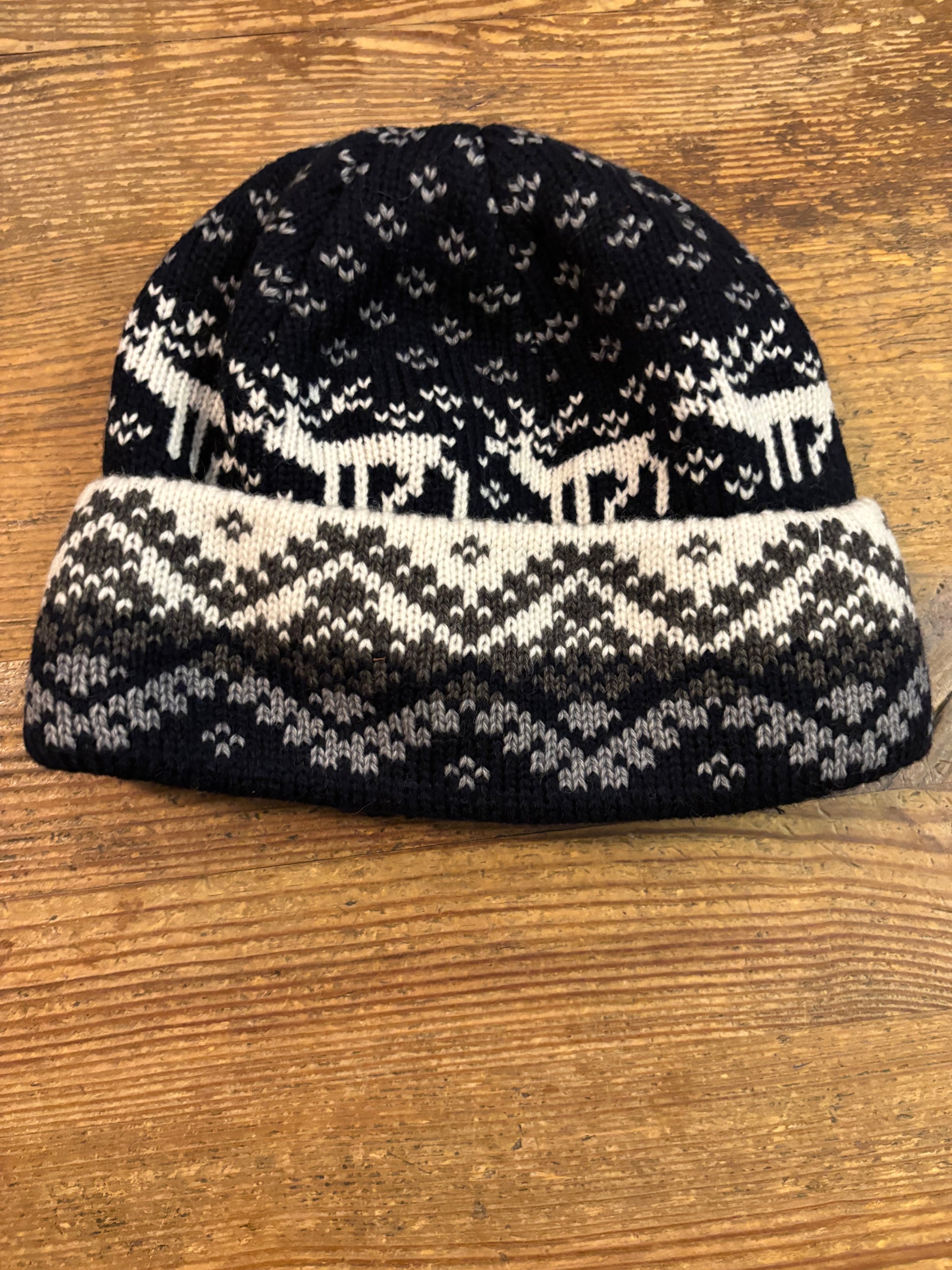 Dark Blue Wool Hat with Reindeer Pattern and Fleece Lining