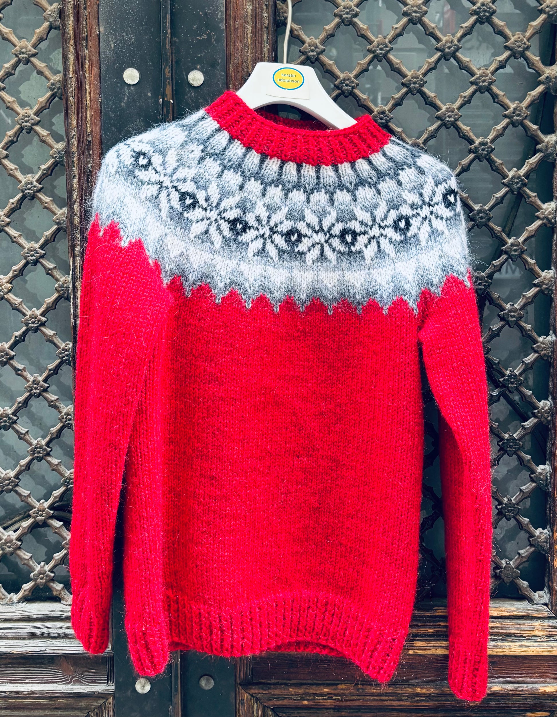 Hand-Knitted Nordic Sweater in Wool and Mohair –Red white and grey